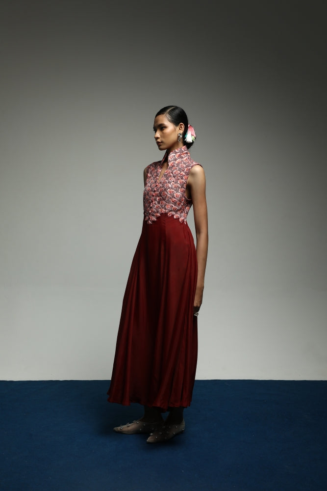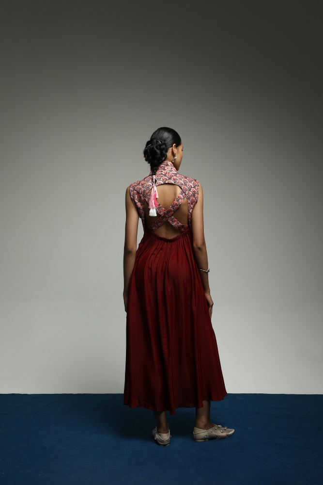 The deep maroon hue adds warmth and depth, exuding confidence while accentuating the intricate wave motif with soft luminosity. Designed for movement and grace, the Japan Wave Backless Dress expresses Purana’s essence — elegance in motion, culture in detail, and beauty in flow.