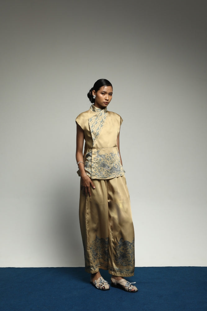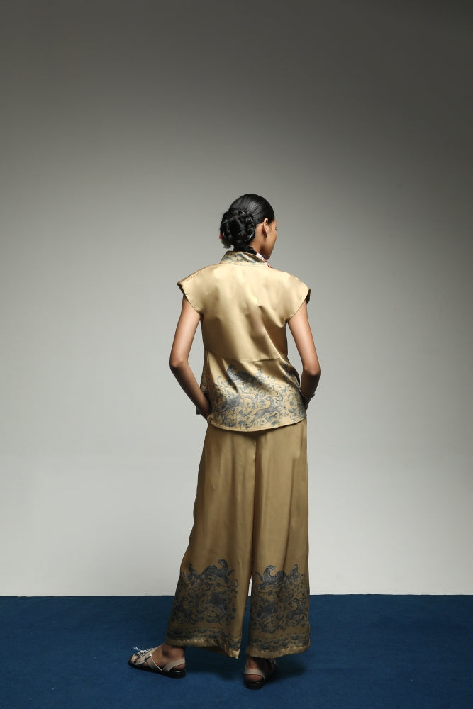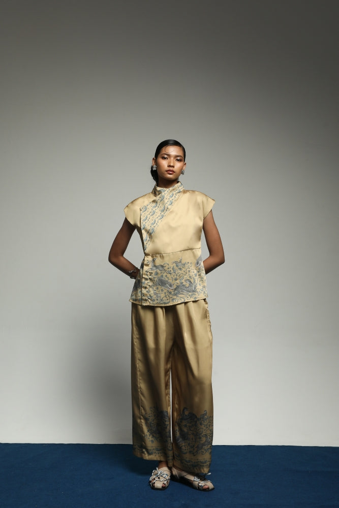 The gold hue radiates warmth and quiet confidence, highlighting the intricacy of the motif with luminous depth. With its relaxed yet structured silhouette, the Jungle Overlap Top pairs beautifully with matching Jungle Pants or tailored separates, embodying Purana’s essence — art in motion, culture in detail, and beauty in balance.