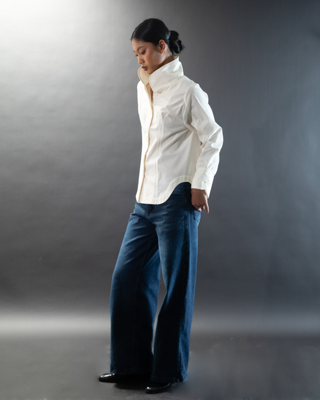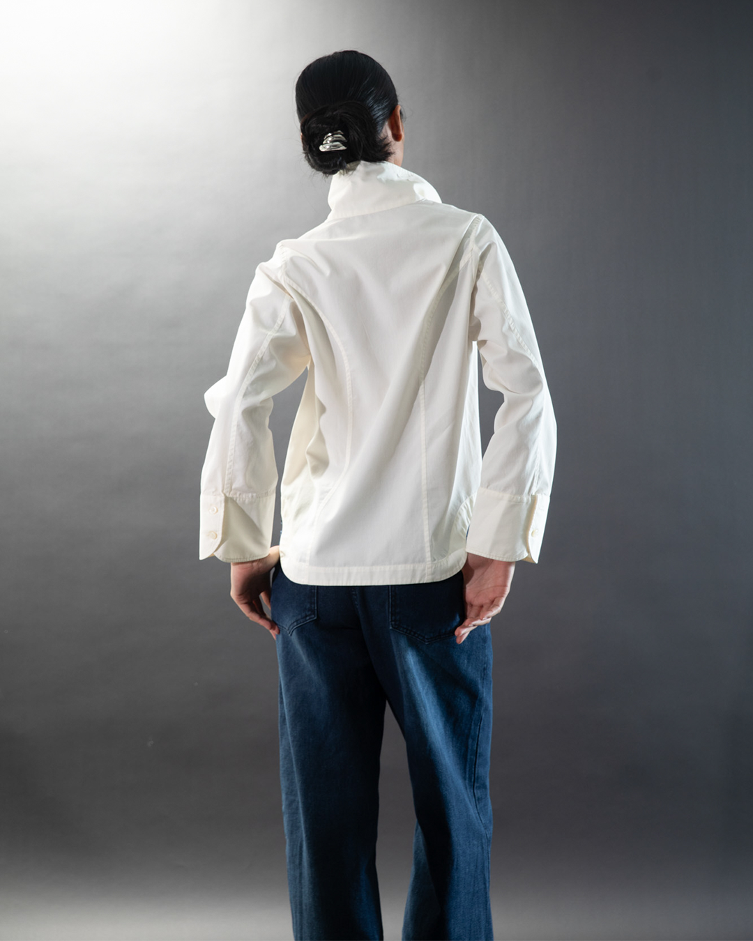 Features a high collar, full front button opening, and wide sleeves with statement cuffs for tailored elegance and subtle detail.