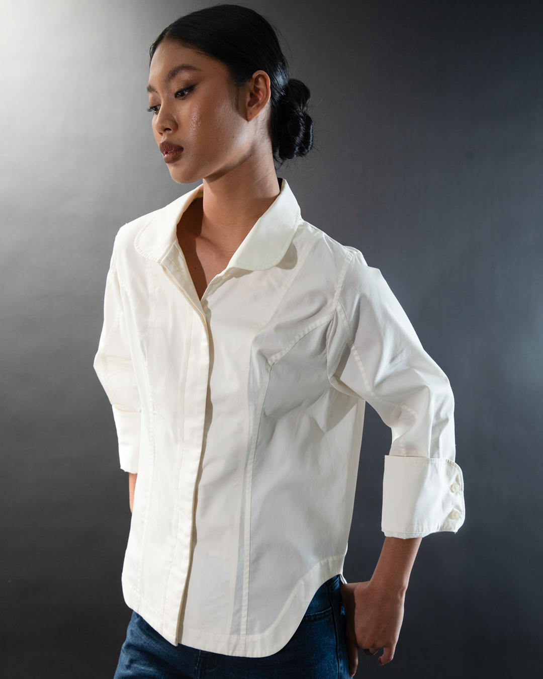 A refined twist on the classic shirt with sculpted curved panels that flatter the feminine silhouette and add a crisp, modern edge.