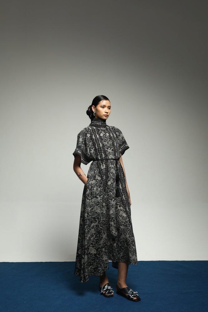 The PURANA High Neck Dress Full Motif from the Tropipelago Collection embodies refined strength and quiet elegance — a seamless blend of cultural narrative and contemporary sophistication.
