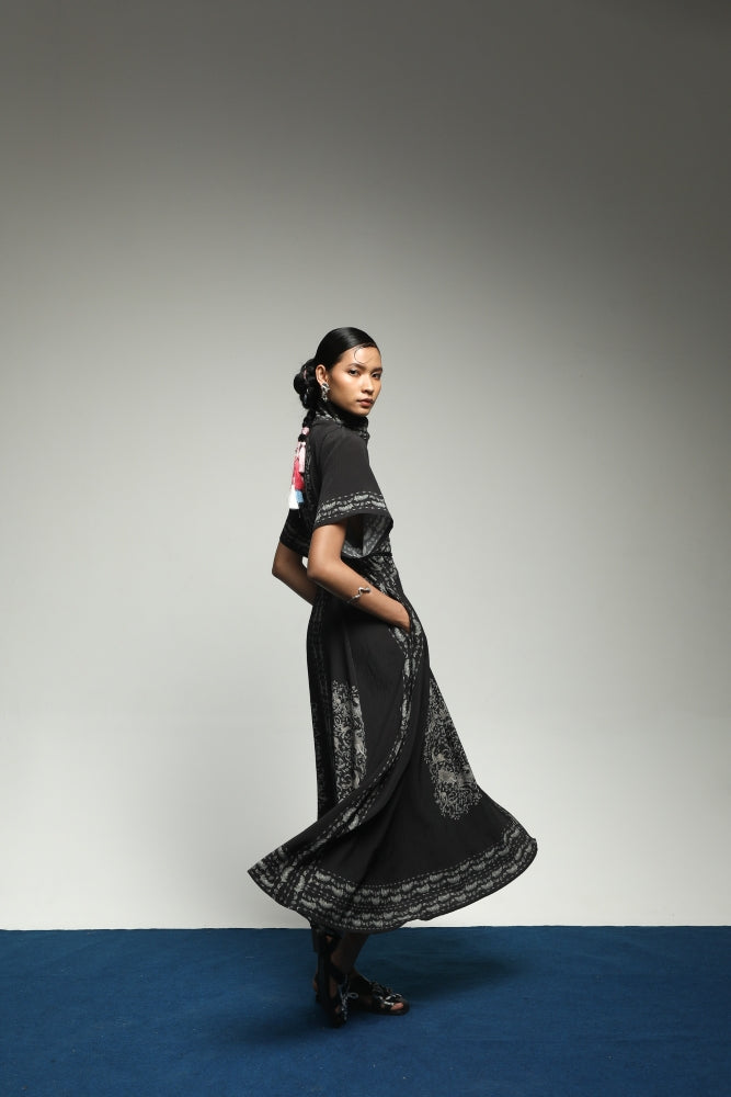 The Tropipelago concept celebrates Indonesia’s vast natural and cultural landscape — where every piece reflects the harmony between earth, ocean, and artistry. With its minimal yet sculptural form, the High Neck Dress captures this philosophy through movement and structure, embodying Purana’s vision of wearable art that transcends time and trend.