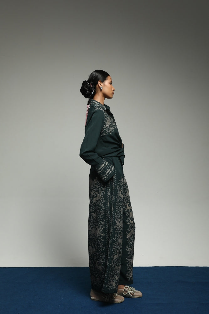 Crafted from 100% premium polyester, these wide-leg pants in rich emerald offer a flowing silhouette that moves gracefully with every step. Lightweight yet structured, they are designed for effortless versatility — perfect for resort moments, artful gatherings, or everyday sophistication.
