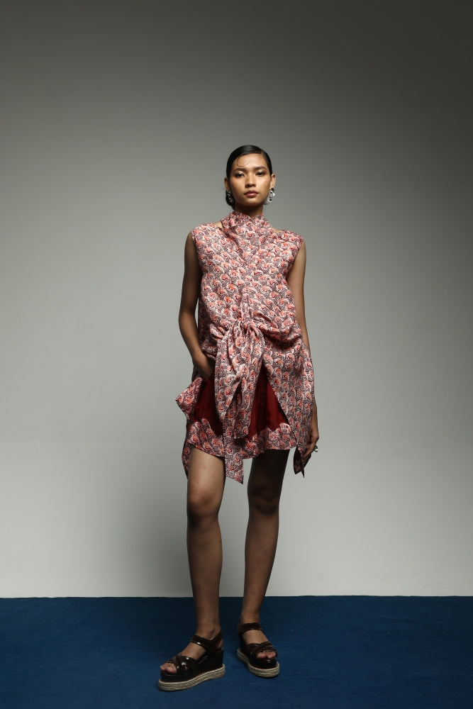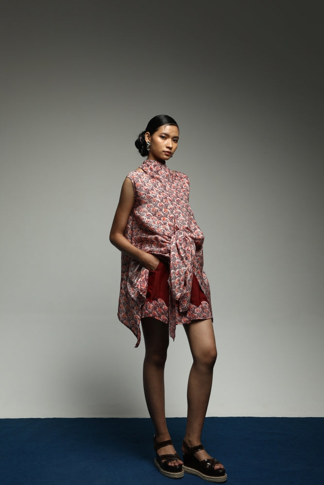 The asymmetric silhouette and front tie detail create a contemporary flow, accentuating the body with effortless grace. Designed with a halter neckline, this piece enhances feminine charm while ensuring comfort and ease of movement.