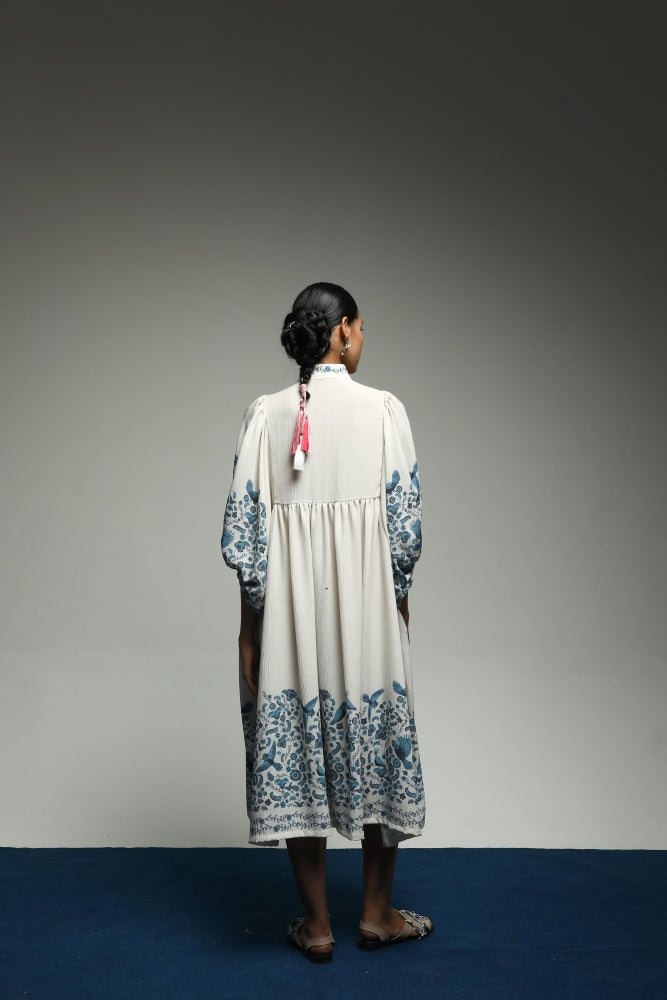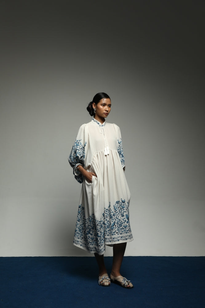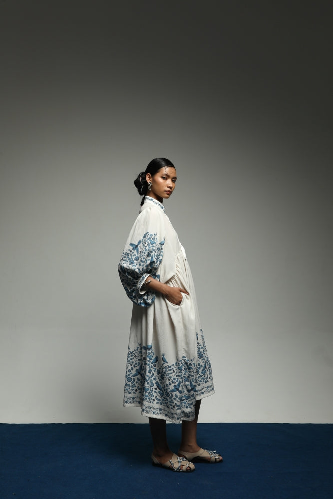 The off-white tone serves as a serene canvas for the delicate blue Birds motif, evoking tranquility and purity. Designed for modern women who value both comfort and consciousness, this dress speaks softly yet powerfully — embodying Purana’s timeless aesthetic.